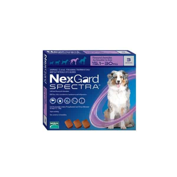 KRPELJI:  4 nedelje efikasne zaštite od 3 najčešće vrste krpelja u Evropi. Efikasan je protiv najčešćih gastro-intestinalnih parazita: NexGard Spectra je pokazao efikasnost od 92,5 do 99,2% u slučajevima prirodne i eksperimentalne infestacije helmintima (u zavisnosti od vrste nematoda). Prevencija bolesti srčanog crva: – 100% efikasnosti protiv larvi Dirofilaria immitis. – U endemskim područjima se preporučuje mesečni tretman. Ukusna poslastica protiv buva i krpelja, koja se jednostavno daje jedanput mesečno. Jedna tableta se daje oralno i aromatizovana je ukusom govedine.